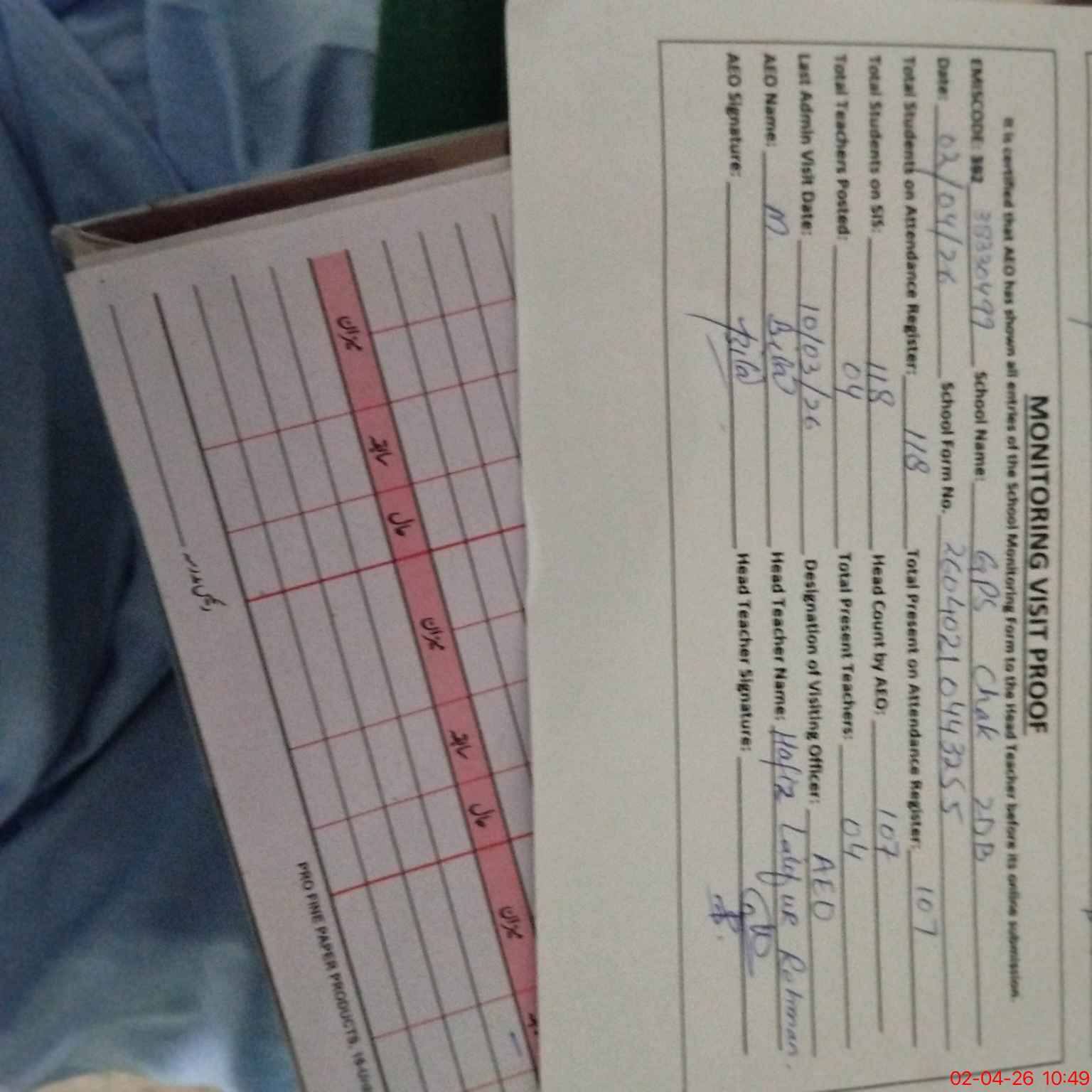 | Attendance Register | Head Teacher | MEA with School | Visit Proof |