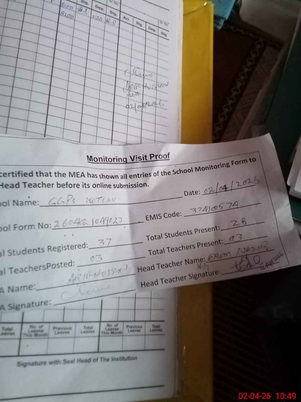 | Attendance Register | Head Teacher | MEA with School | Visit Proof |