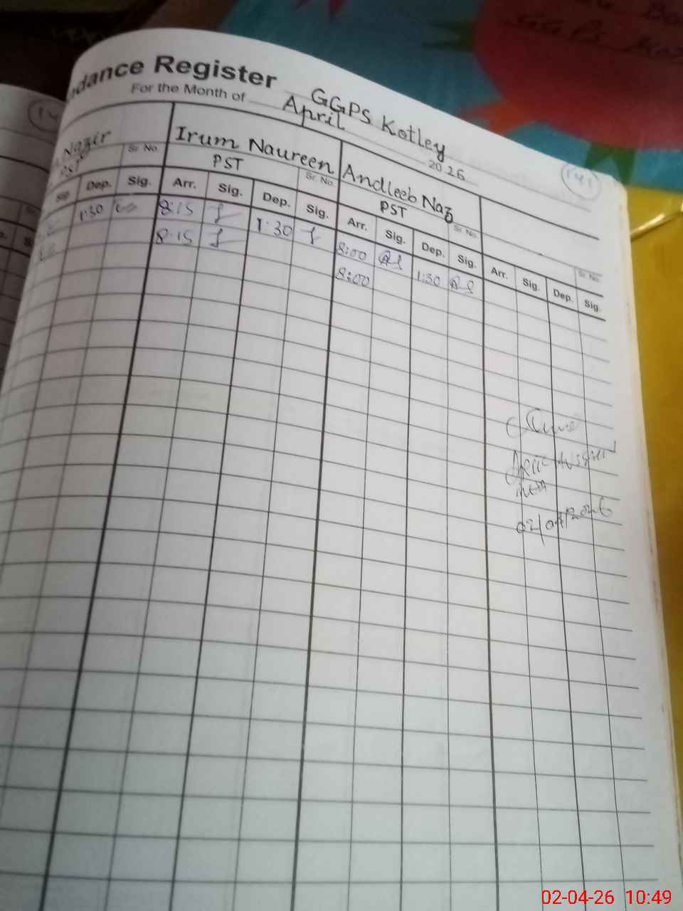 | CNIC | Full Name | Designation | R/C | Absence During Last Calender Month |