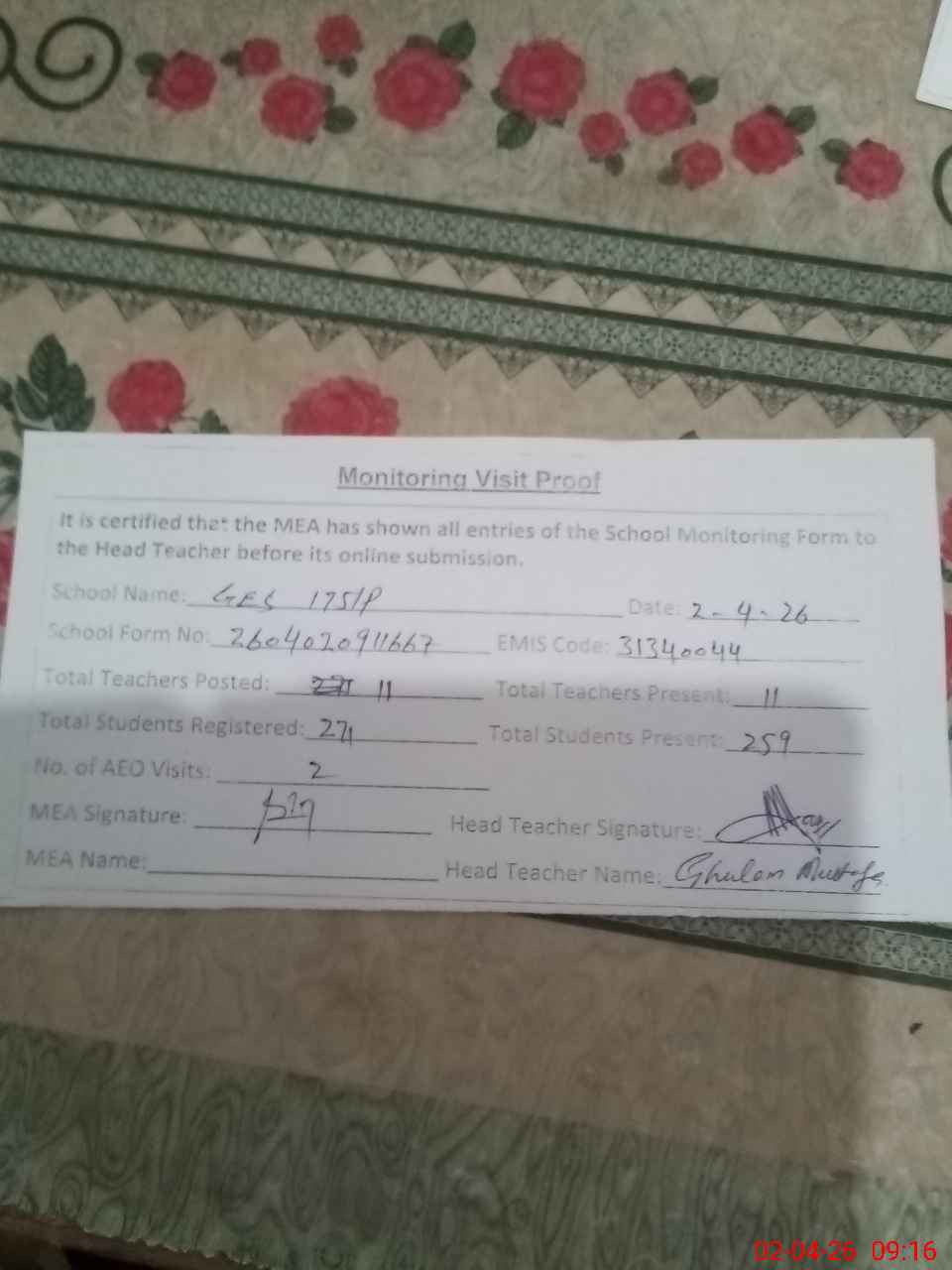 | EMIS Code: 31340044 | Name of School: GES CHAK NO 175/P | |||