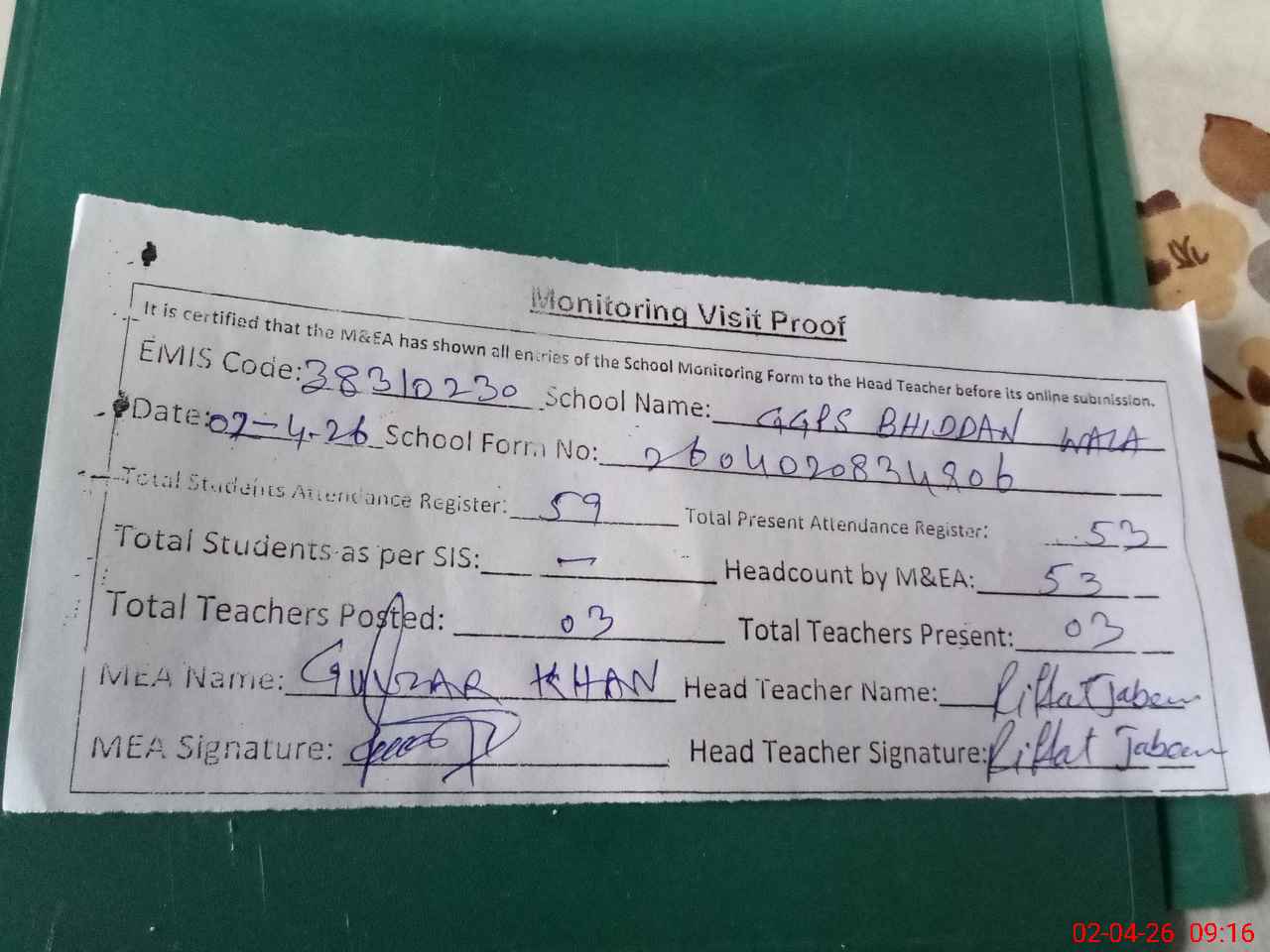 | EMIS Code: 38310230 | Name of School: GGPS BHIDDAN WALA | |||