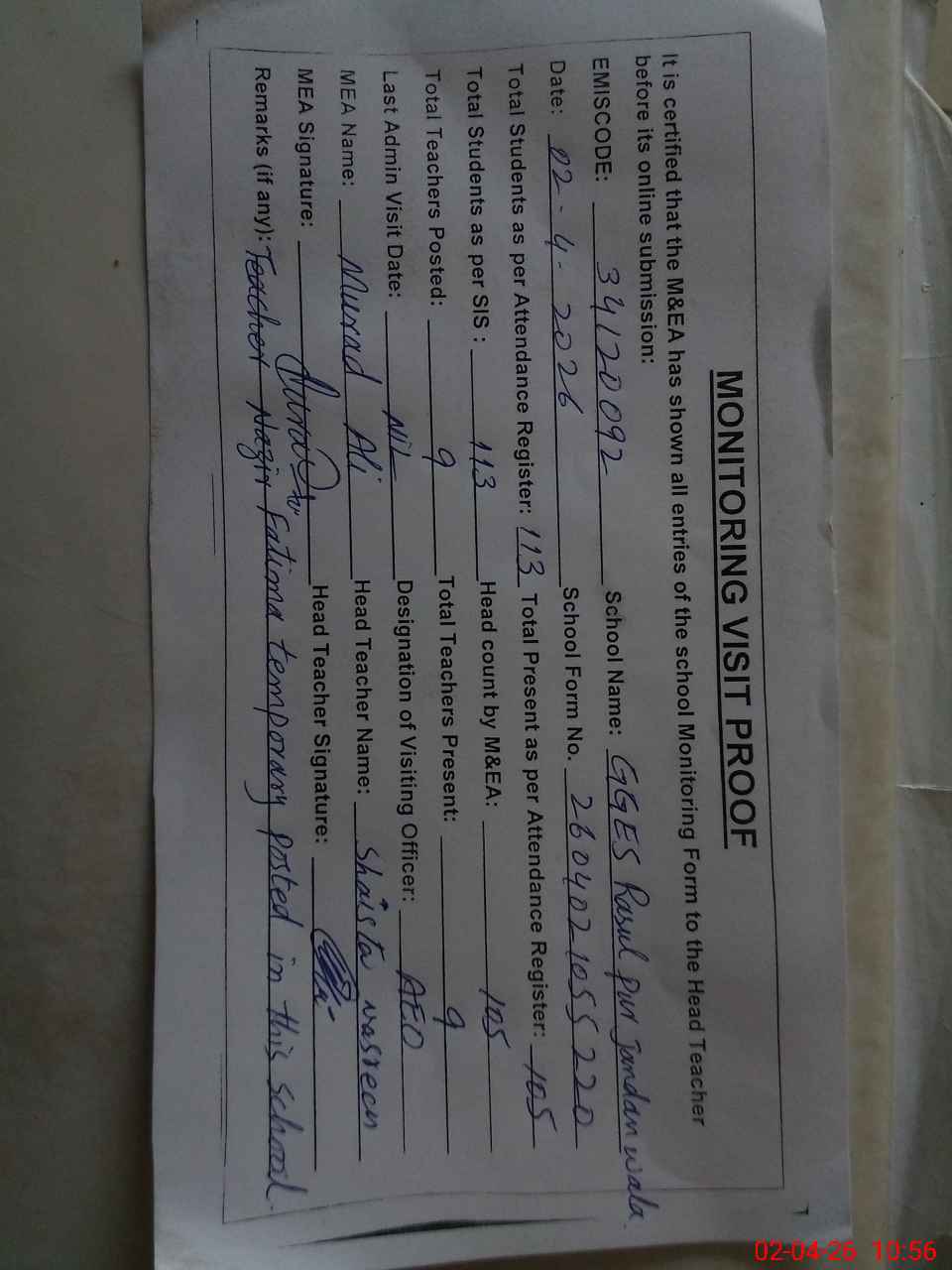 | Attendance Register | Head Teacher | MEA with School | Visit Proof |