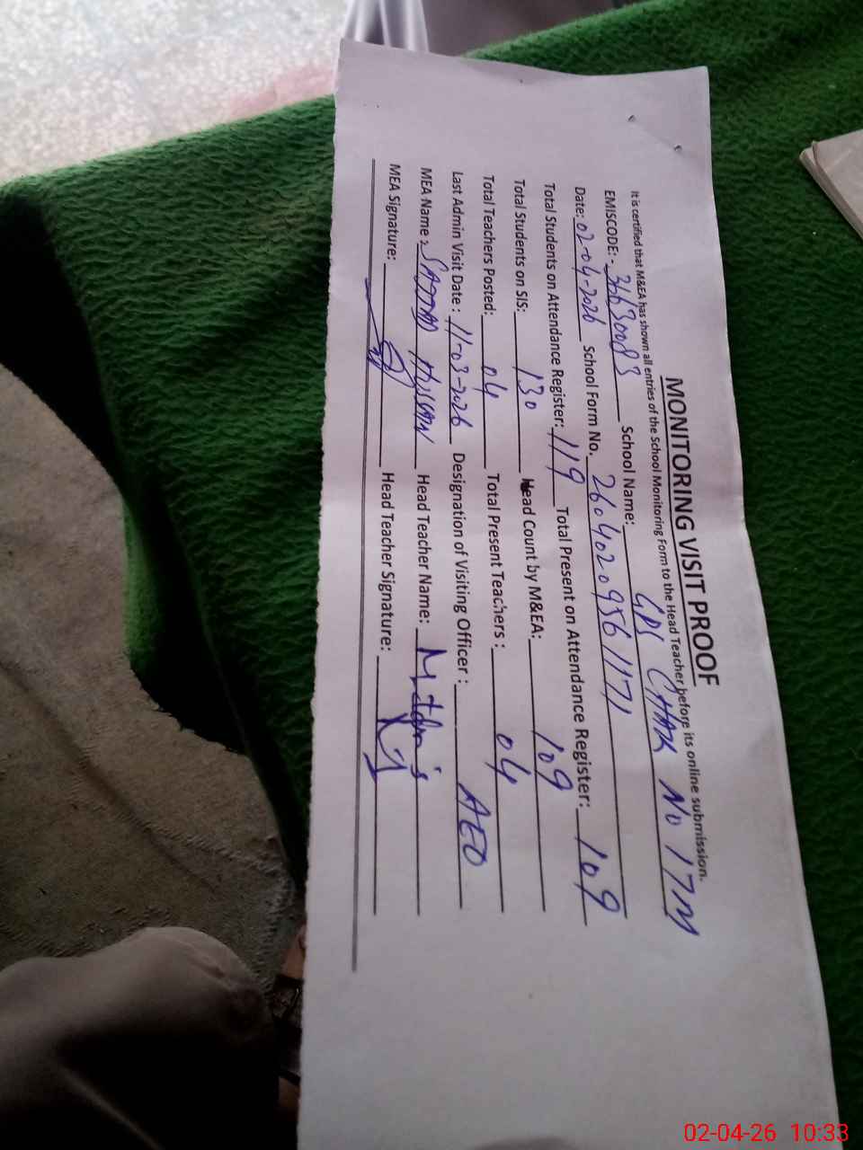 | Attendance Register | Head Teacher | MEA with School | Visit Proof |