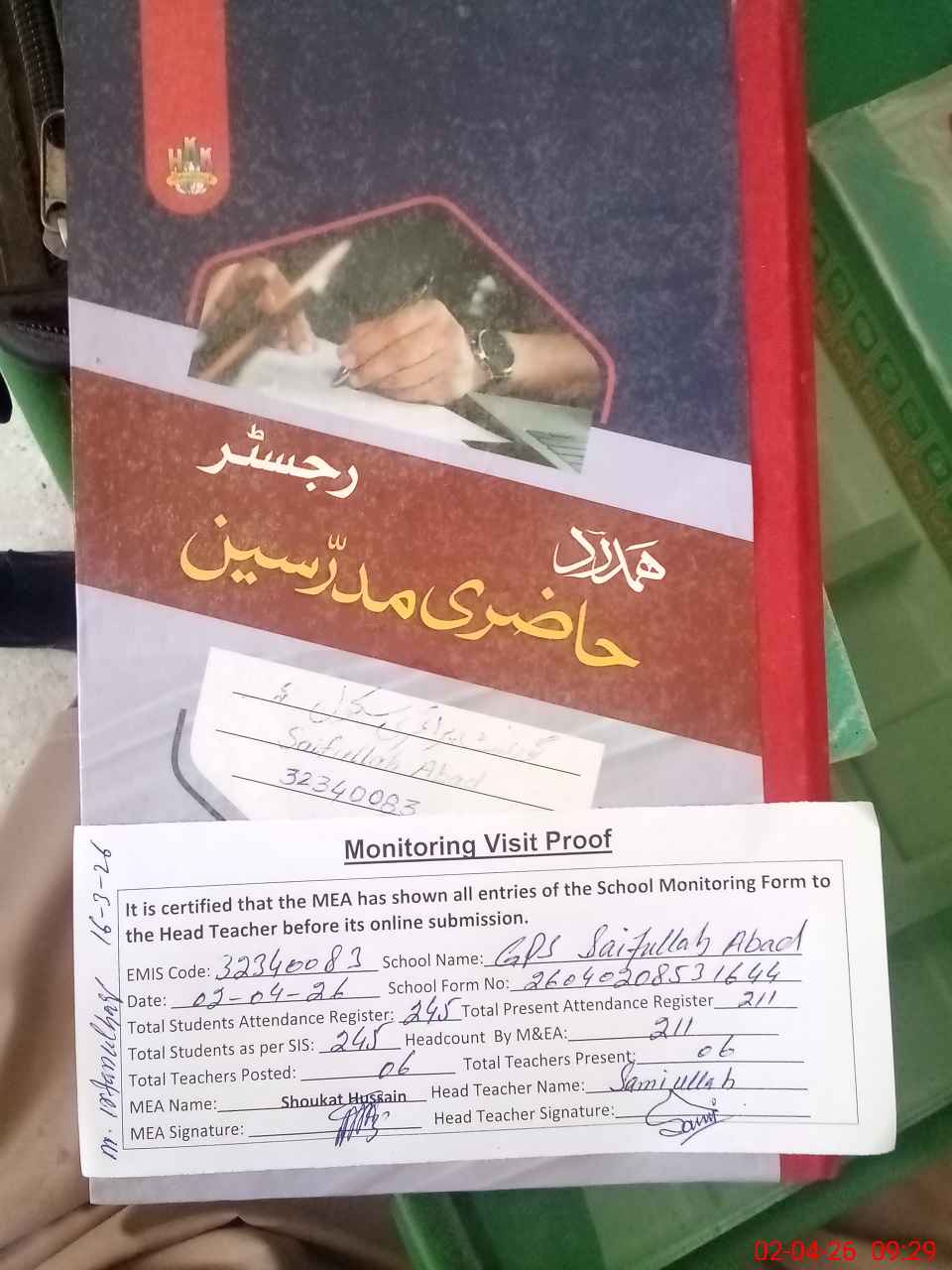 | Attendance Register | Head Teacher | MEA with School | Visit Proof |