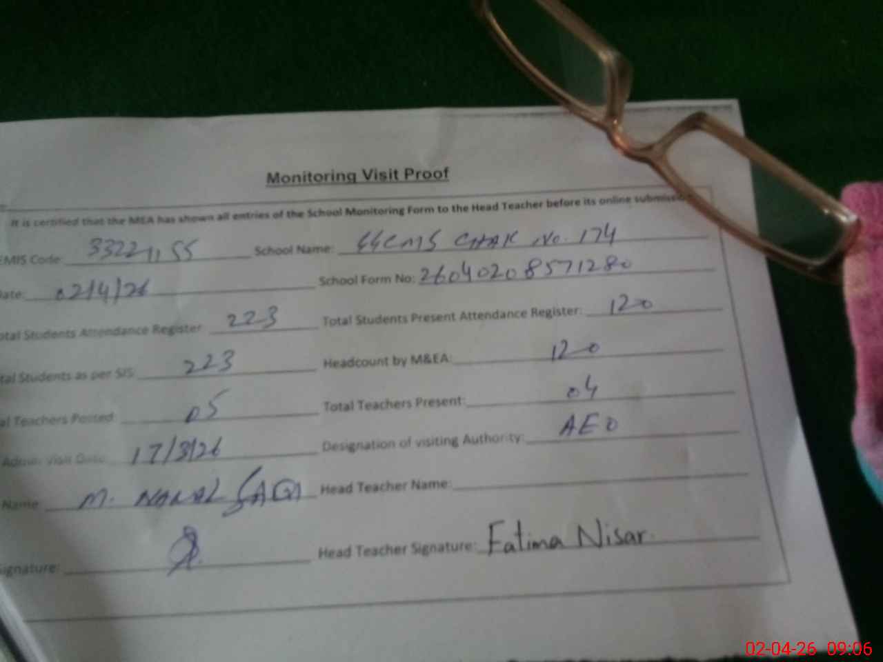 | Attendance Register | Head Teacher | MEA with School | Visit Proof |
