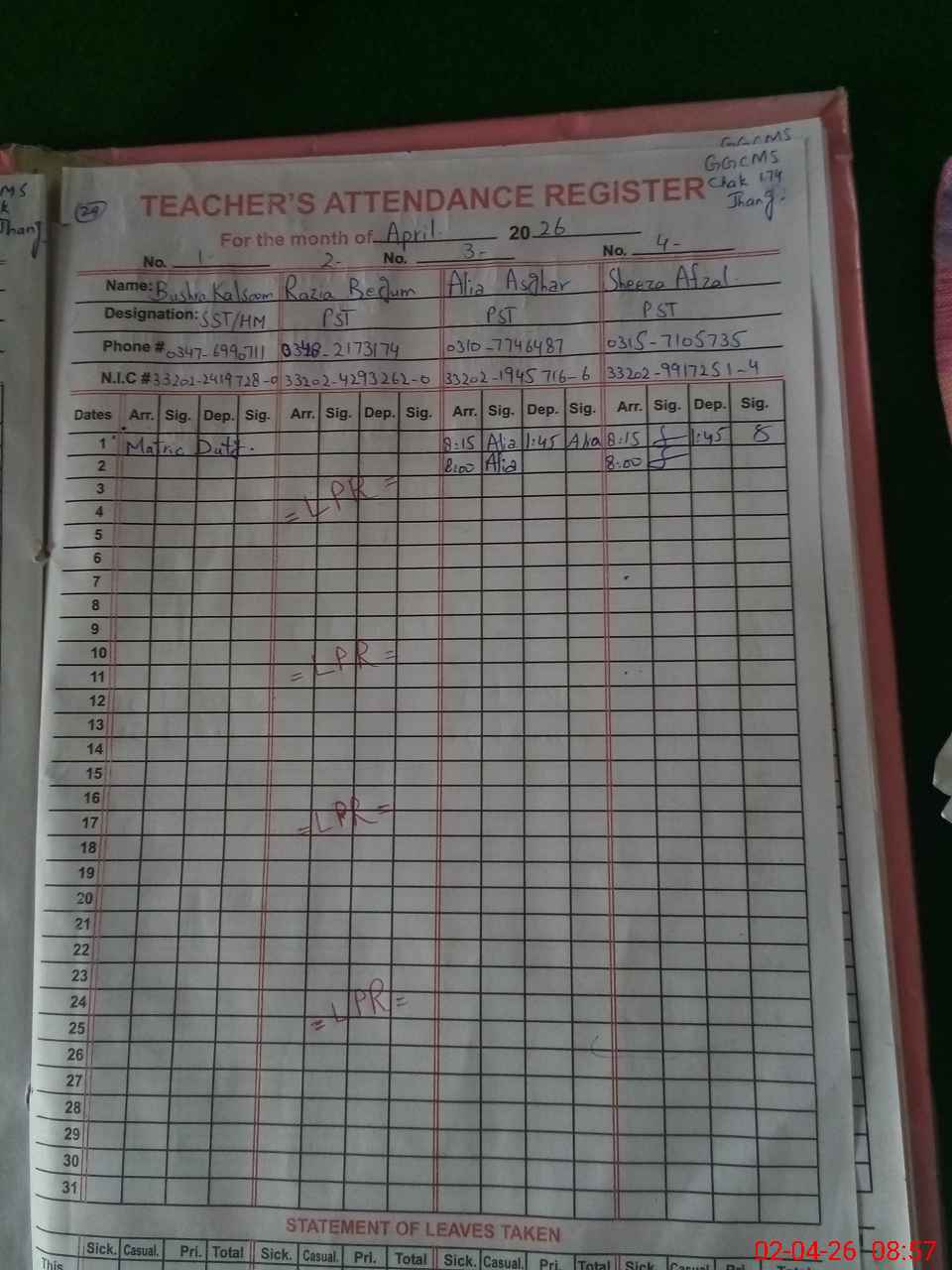 | CNIC | Full Name | Designation | R/C | Absence During Last Calender Month |