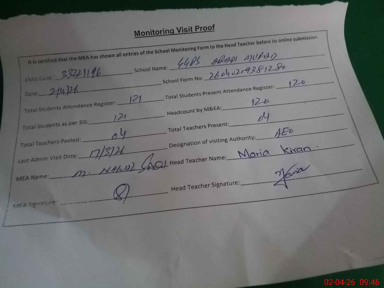 | Attendance Register | Head Teacher | MEA with School | Visit Proof |