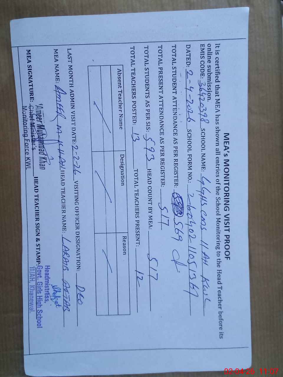 | EMIS Code: 36420398 | Name of School: GGHS CMS 11/AH KHANEWAL | |||
