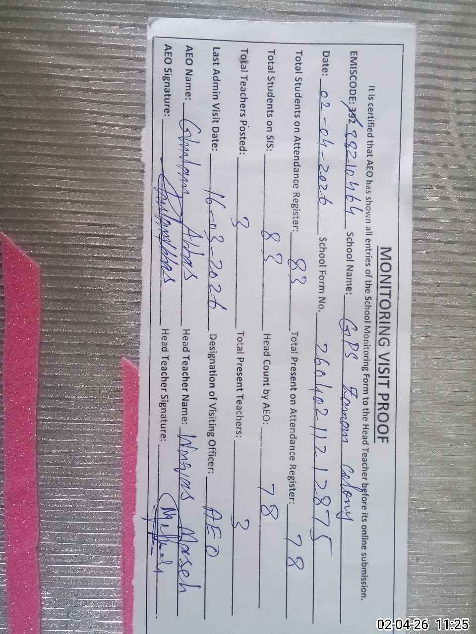 | Attendance Register | Head Teacher | MEA with School | Visit Proof |
