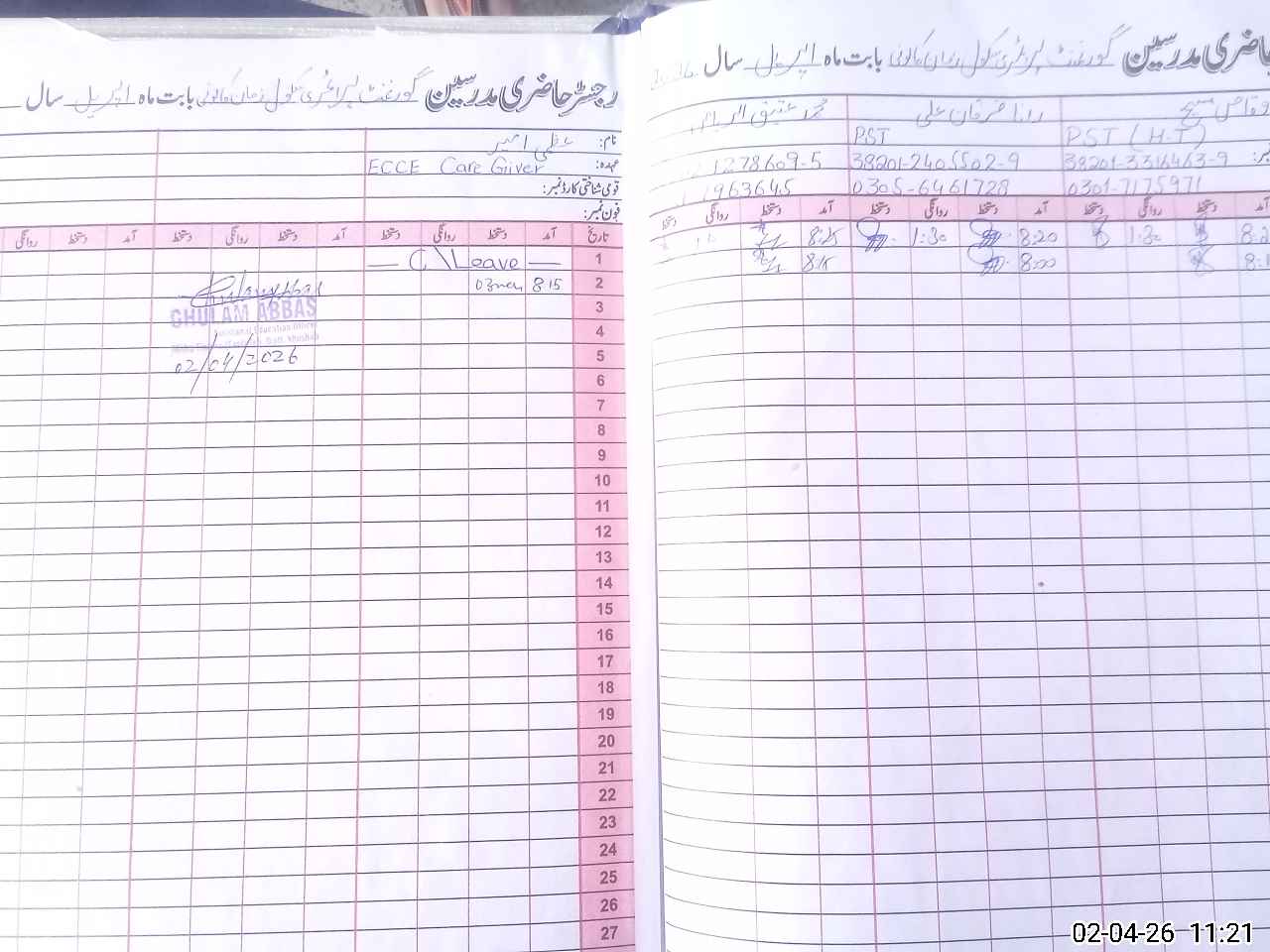 | Name: Wa**** Ma**** Designation: (School Headmaster's/Headmistress's) PST Phone/Cell Number: 03**** |