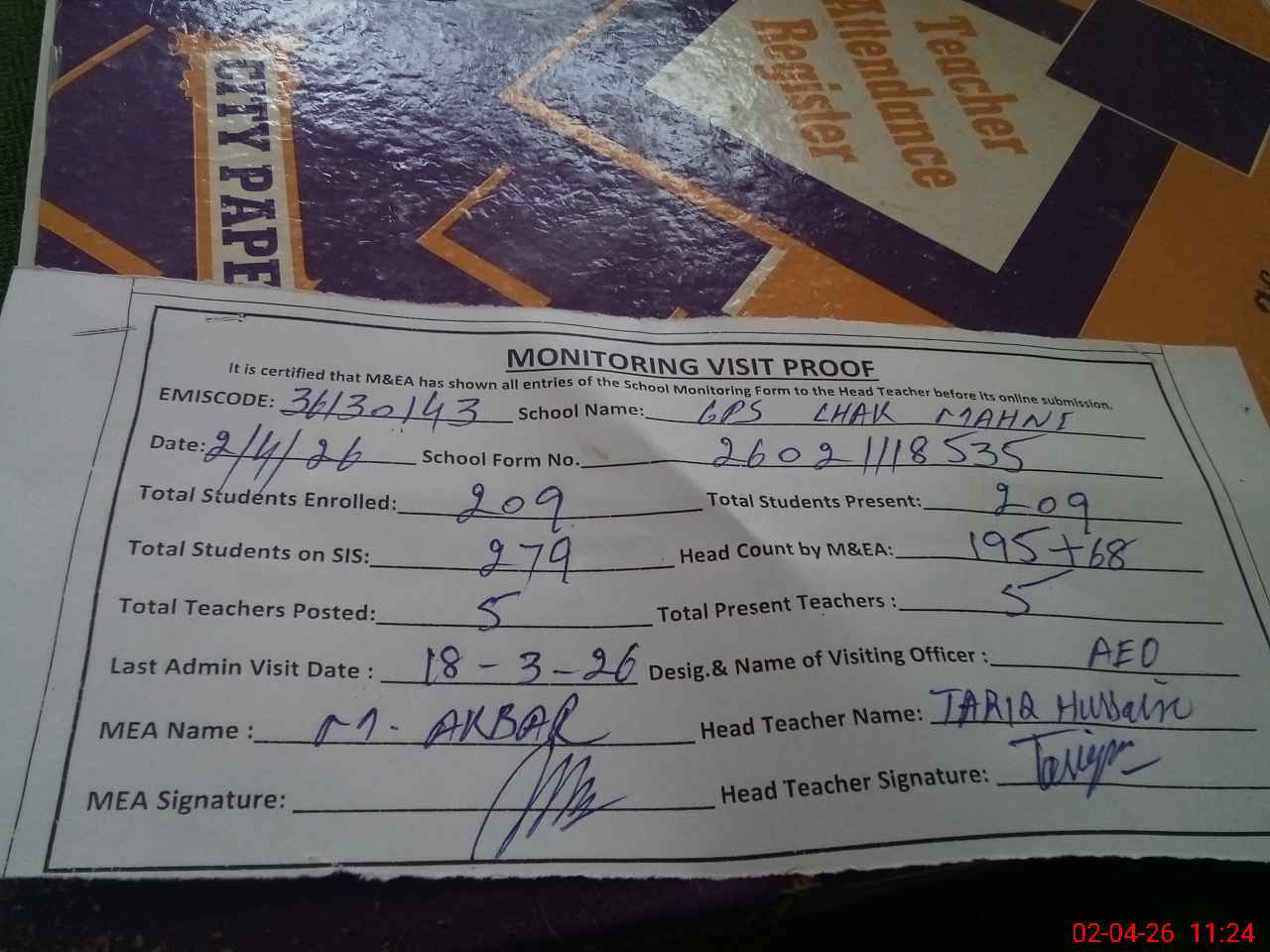| Attendance Register | Head Teacher | MEA with School | Visit Proof |