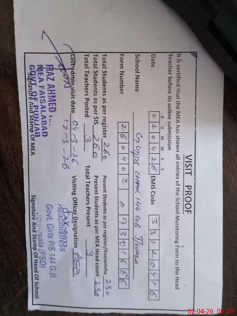 | EMIS Code: 33120416 | Name of School: GGPS CHAK 144 GB LUNDIANWALA | |||
