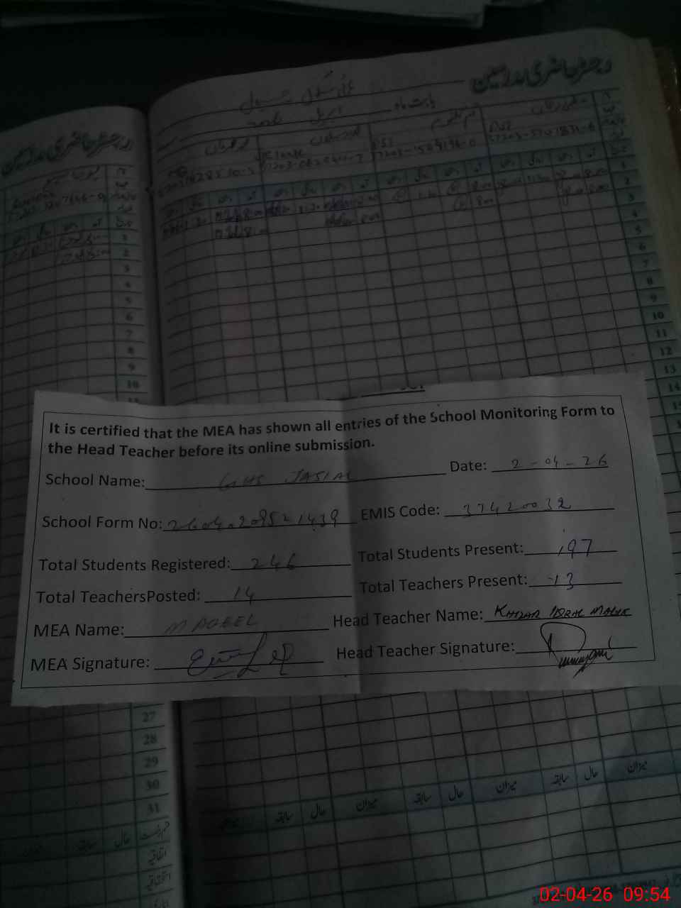 | Attendance Register | Head Teacher | MEA with School | Visit Proof |