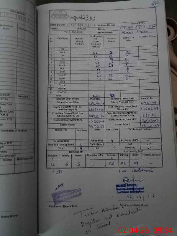 | Remarks (Use Separate Page if Required): During visit found 1-Teacher zeenat Yasmin was not present in school and no sanctioned documents available. 2- Teacher Attendance register not available in school. | |||||