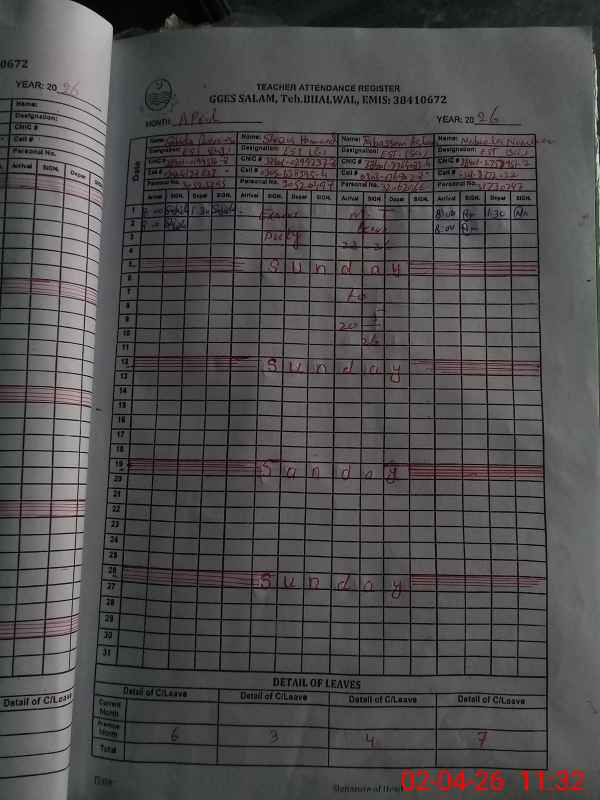| Remarks (Use Separate Page if Required): During visit found teacher Tabsam Aslam was not present in school, she was on maternity leave wef 2 March 2026 but leave did not apply yet. submitted. | |||||