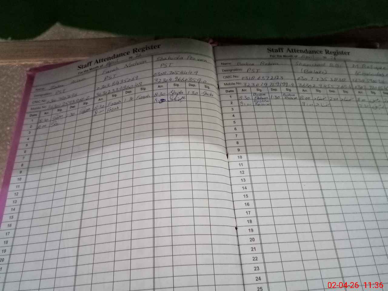 | CNIC | Full Name | Designation | R/C | Absence During Last Calender Month |