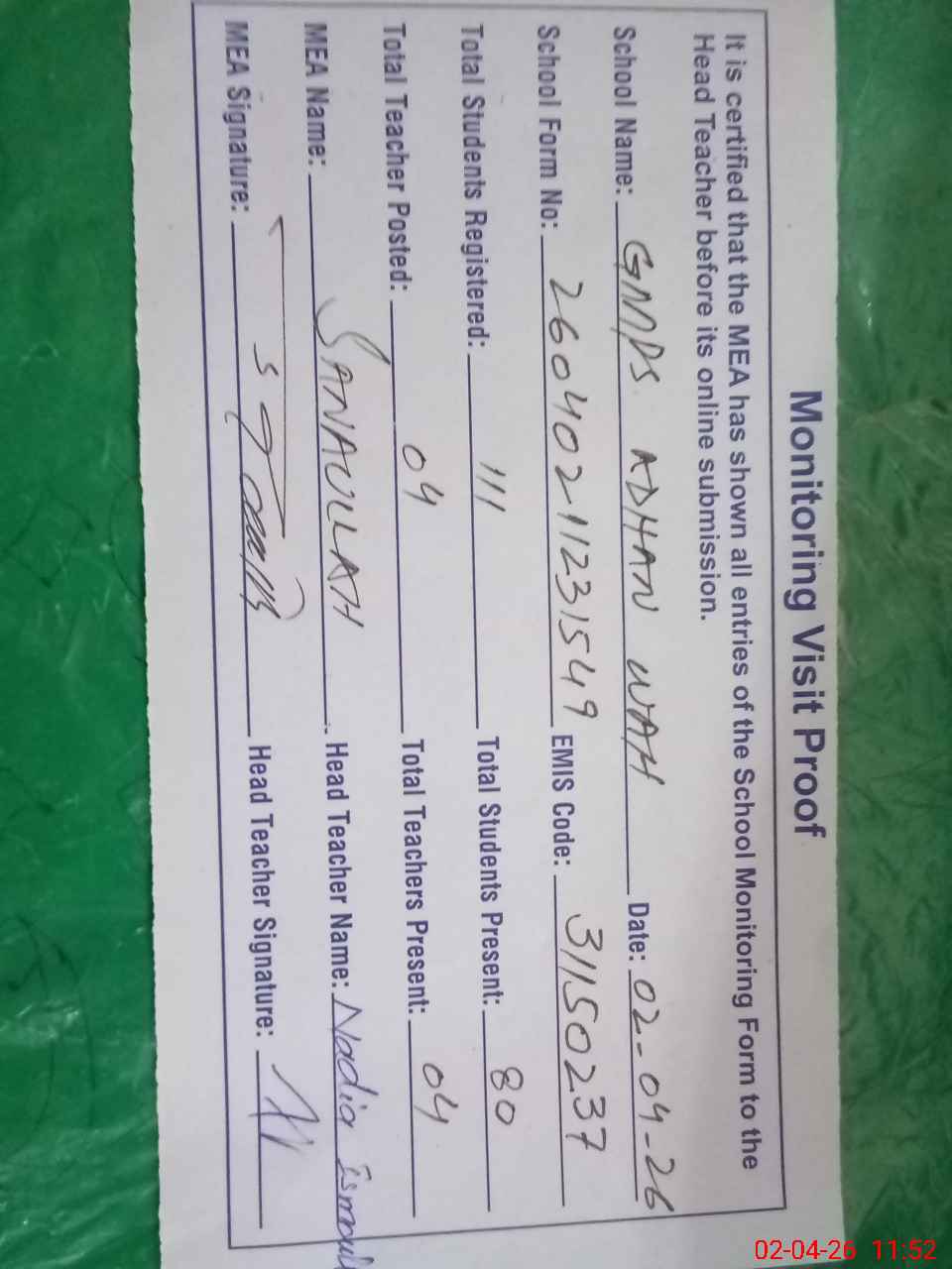 | EMIS Code: 31150237 | Name of School: GMPS ADHAN WAH | |||
