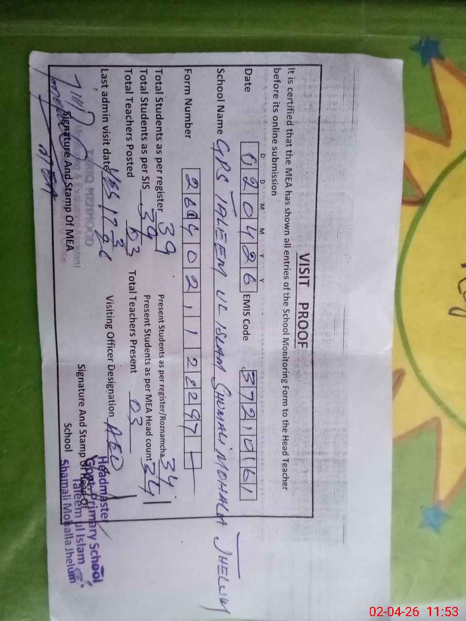 | EMIS Code: 37210161 | Name of School: GPS TALIM UL ISLAM SHUMALI MOHALLA | |||