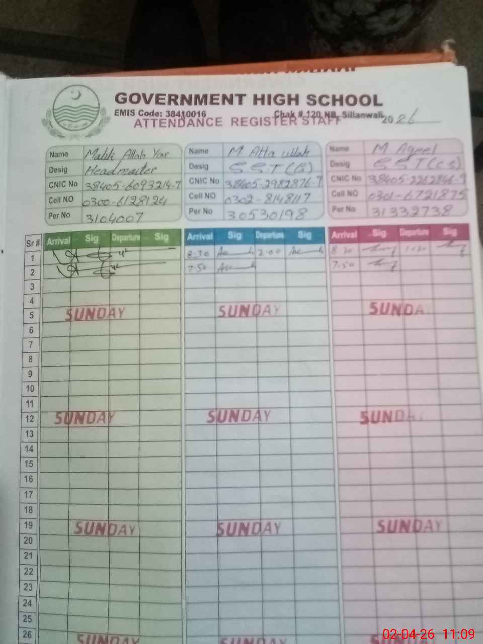 | CNIC | Full Name | Designation | R/C | Absence During Last Calender Month |