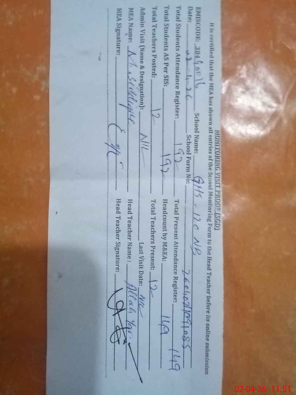 | Attendance Register | Head Teacher | MEA with School | Visit Proof |