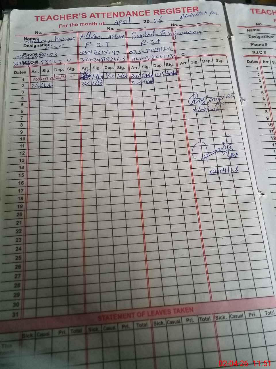| Name: SH**** KO**** Designation: (School Headmaster's/Headmistress's) PST Phone/Cell Number: 03**** |