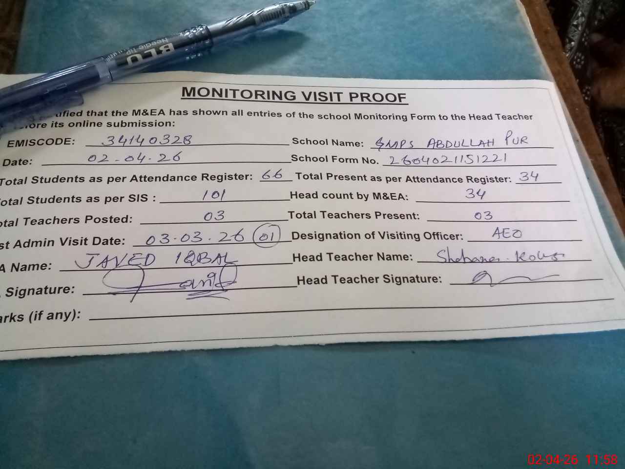 | Attendance Register | Head Teacher | MEA with School | Visit Proof |