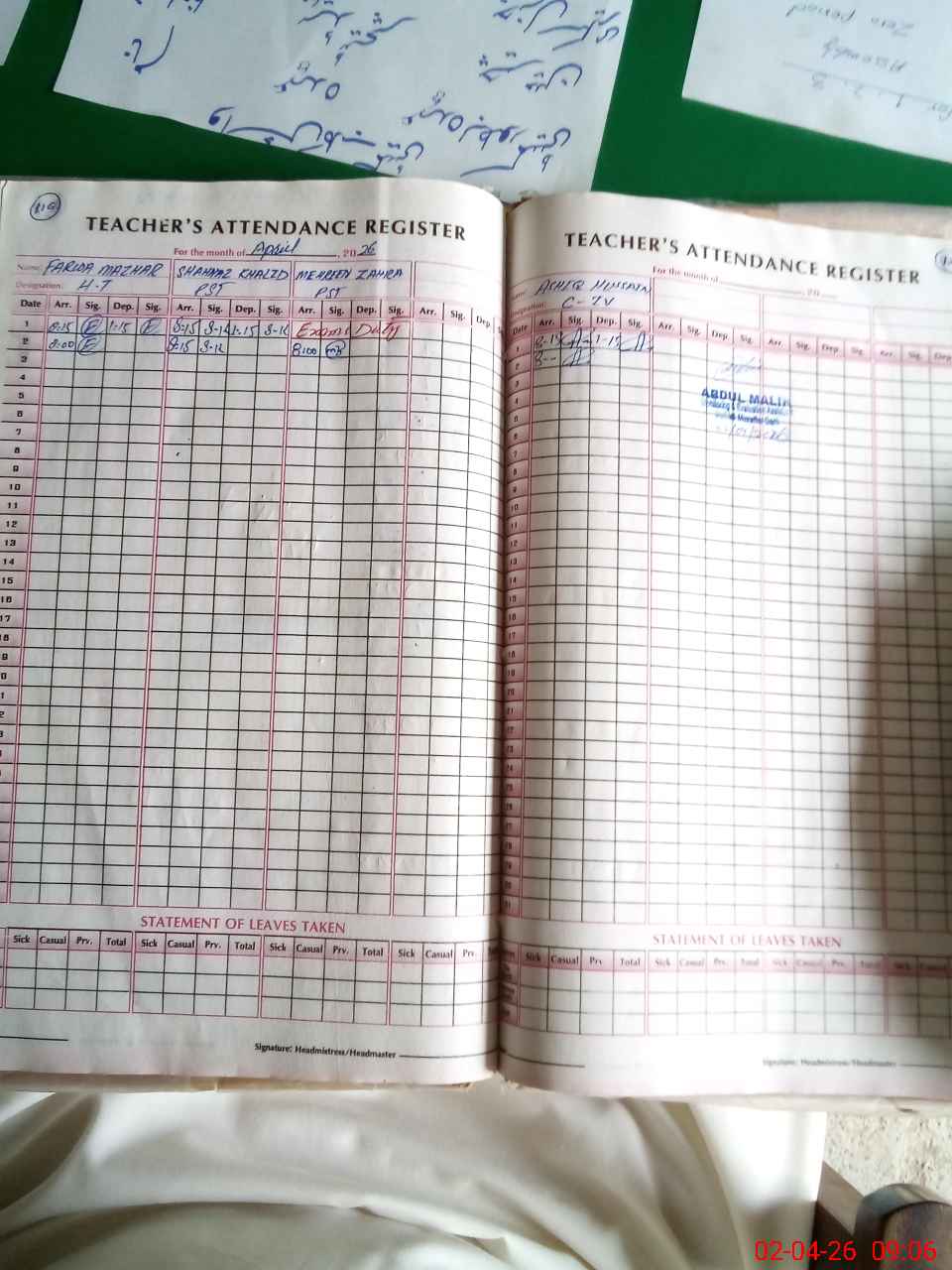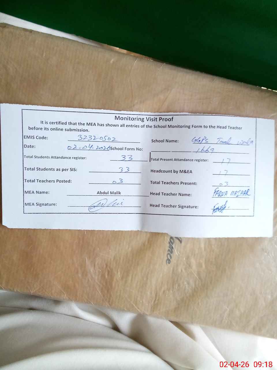 | Attendance Register | Head Teacher | MEA with School | Visit Proof |