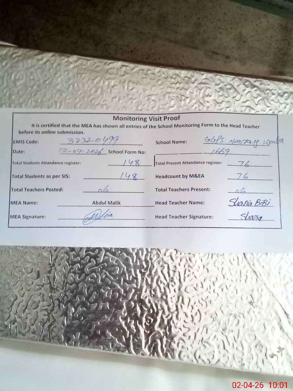 | Attendance Register | Head Teacher | MEA with School | Visit Proof |