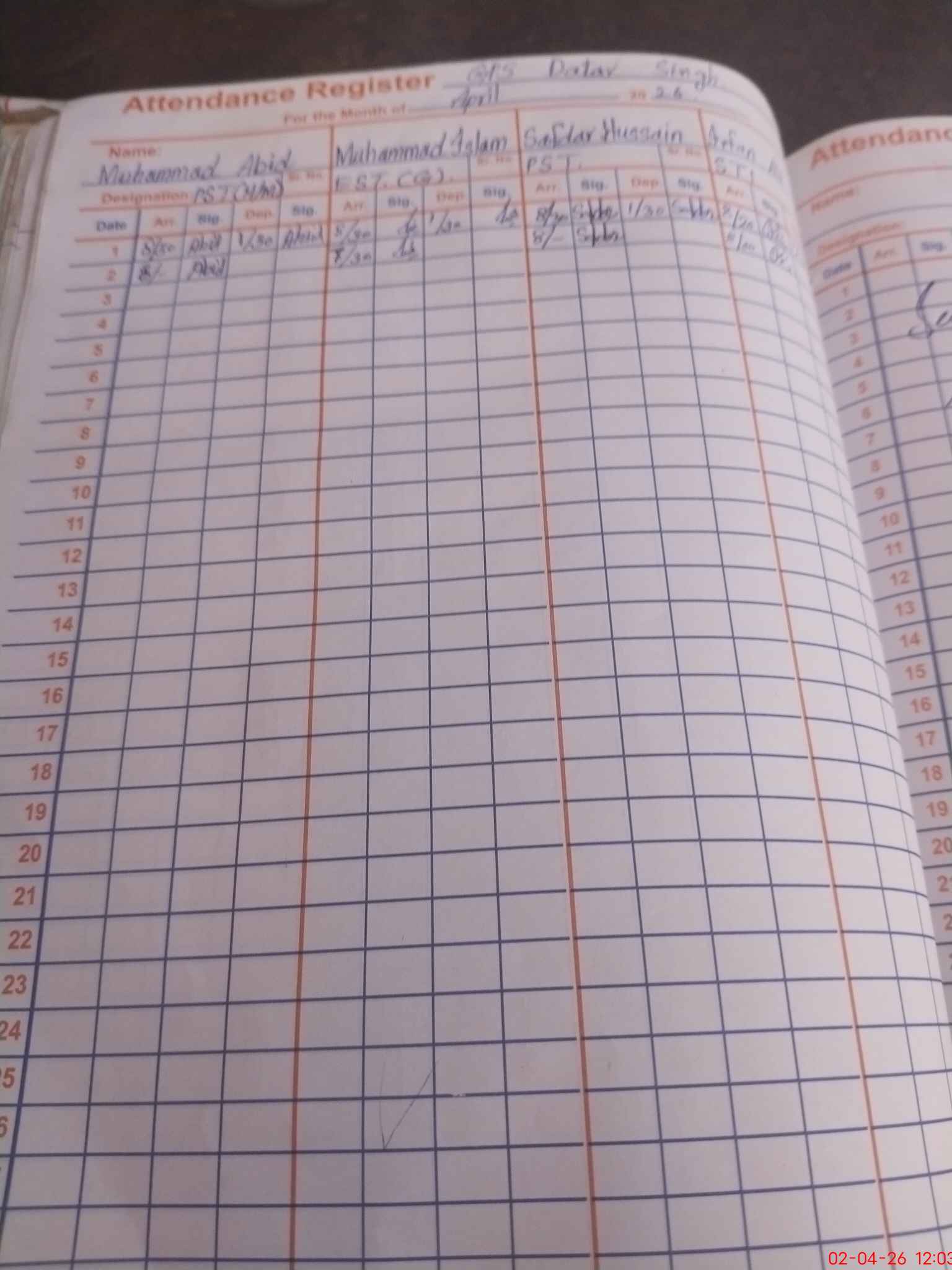 | CNIC | Full Name | Designation | R/C | Absence During Last Calender Month |