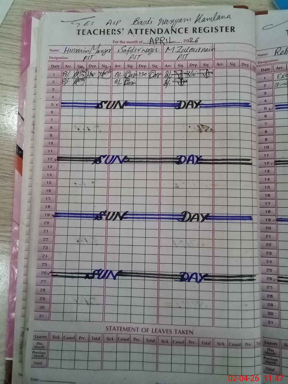 | Remarks (Use Separate Page if Required): New books yet not received for students students attendance list not updated accordingly Afternoon shift students attendance register attendance not marked last working day | |||||