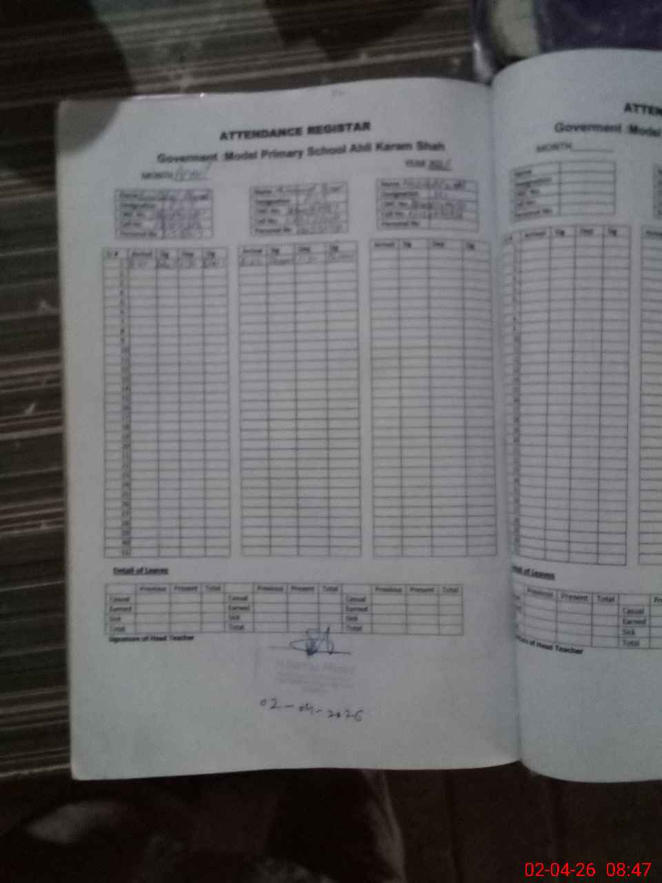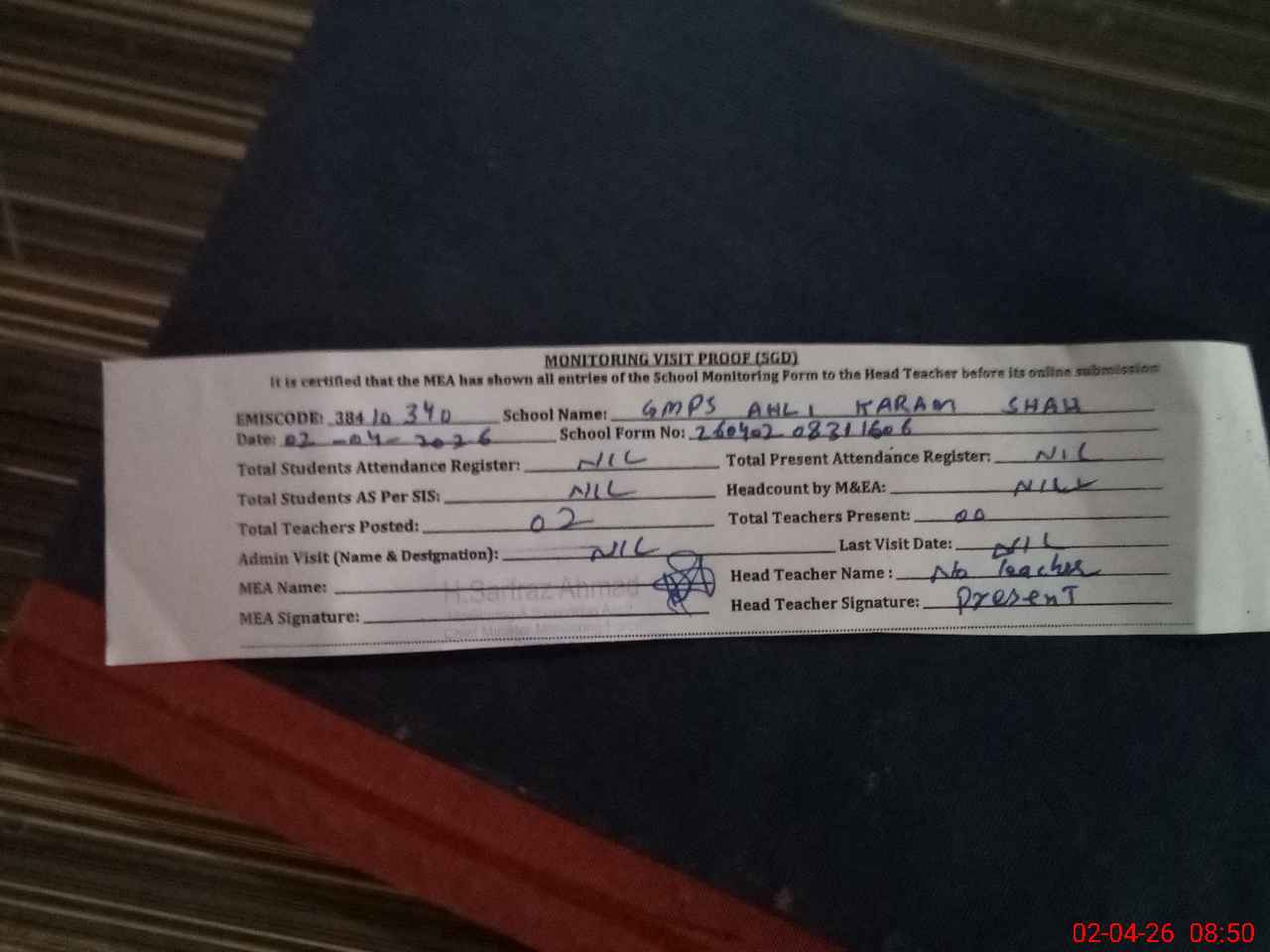 | Attendance Register | Head Teacher | MEA with School | Visit Proof |