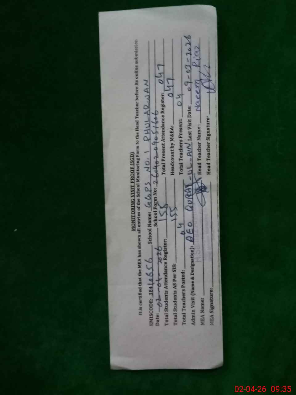 | Attendance Register | Head Teacher | MEA with School | Visit Proof |