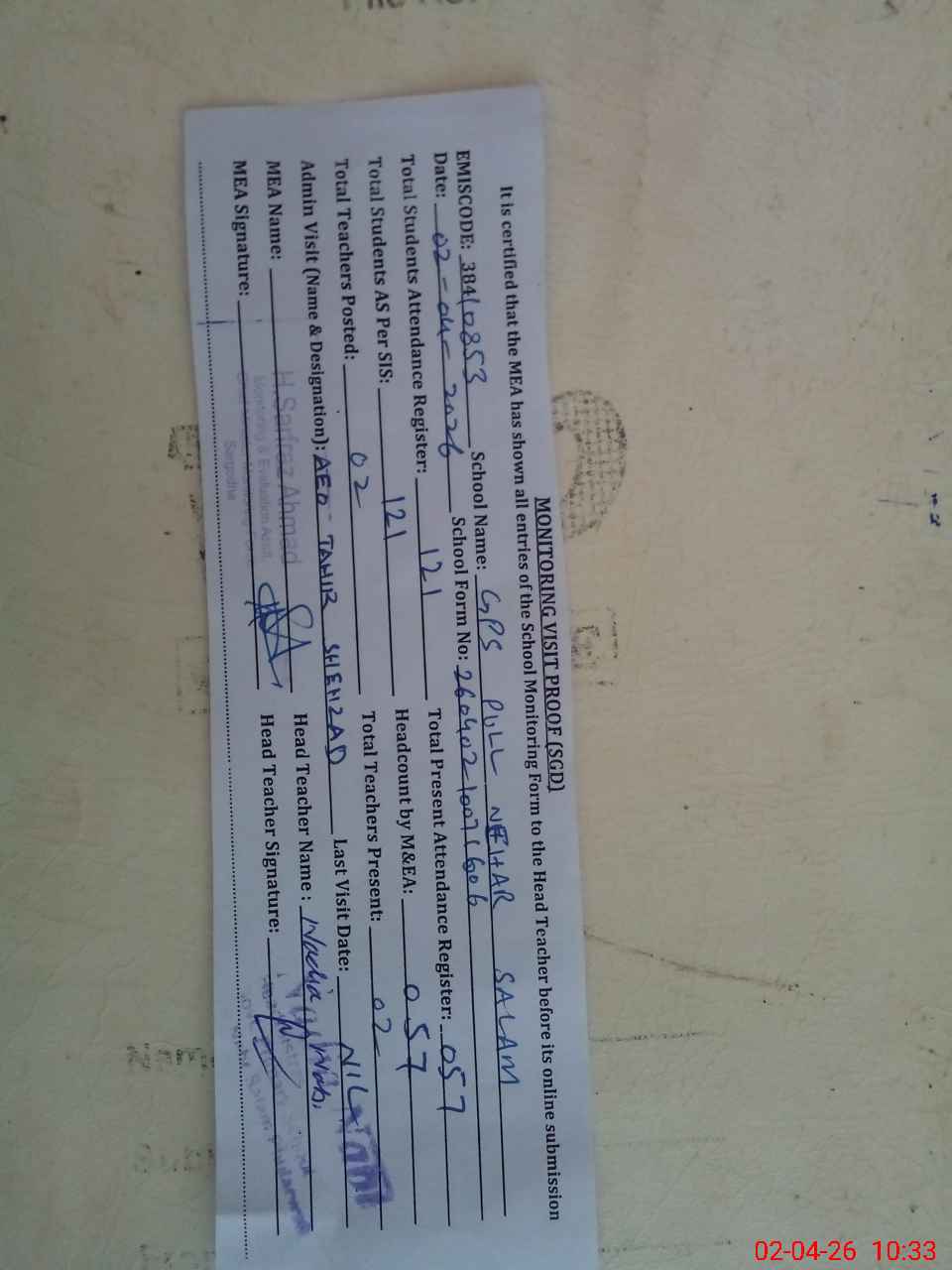 | Attendance Register | Head Teacher | MEA with School | Visit Proof |