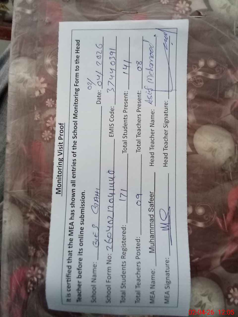 | Attendance Register | Head Teacher | MEA with School | Visit Proof |