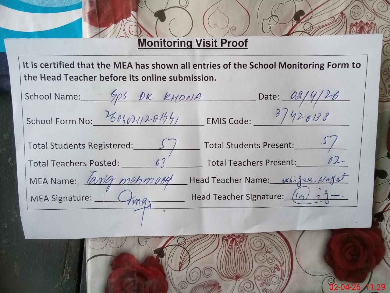| Attendance Register | Head Teacher | MEA with School | Visit Proof |
