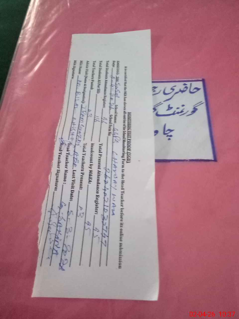 | Attendance Register | Head Teacher | MEA with School | Visit Proof |