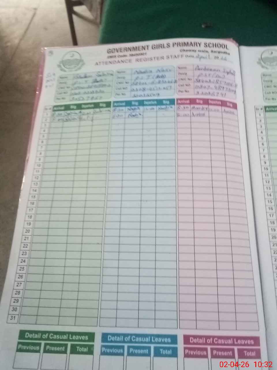 | CNIC | Full Name | Designation | R/C | Absence During Last Calender Month |