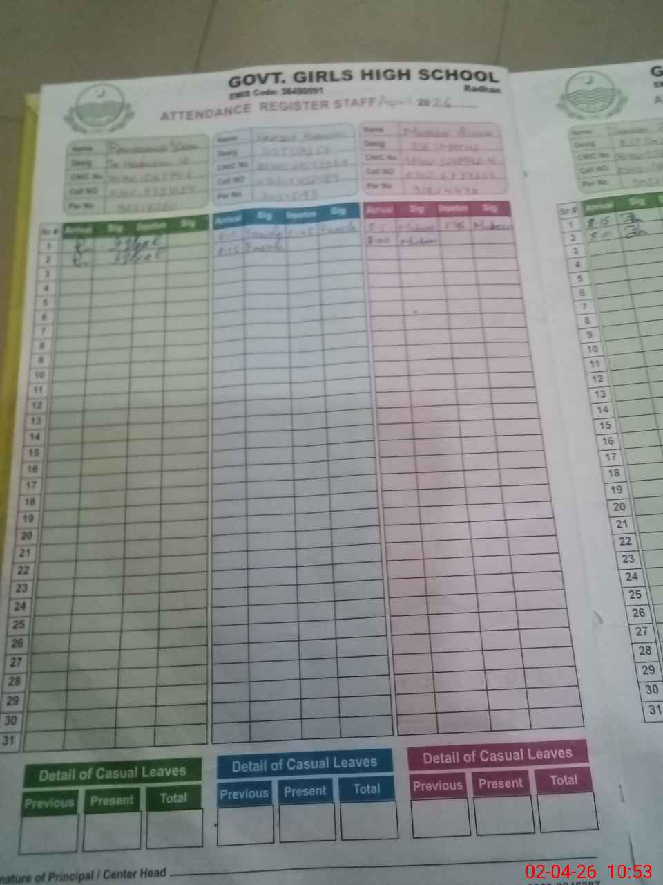 | CNIC | Full Name | Designation | R/C | Absence During Last Calender Month |