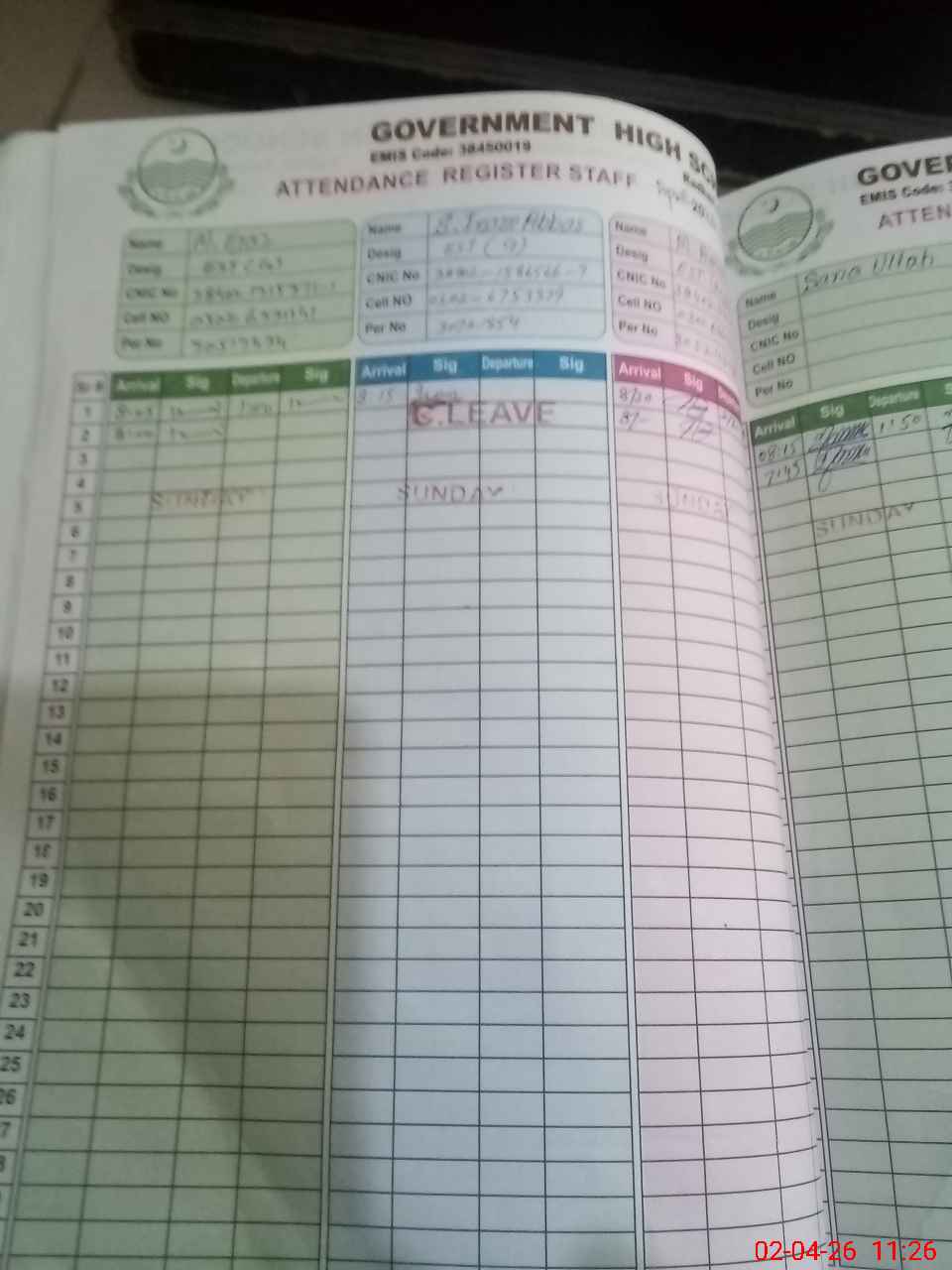 | CNIC | Full Name | Designation | R/C | Absence during last cal. month |