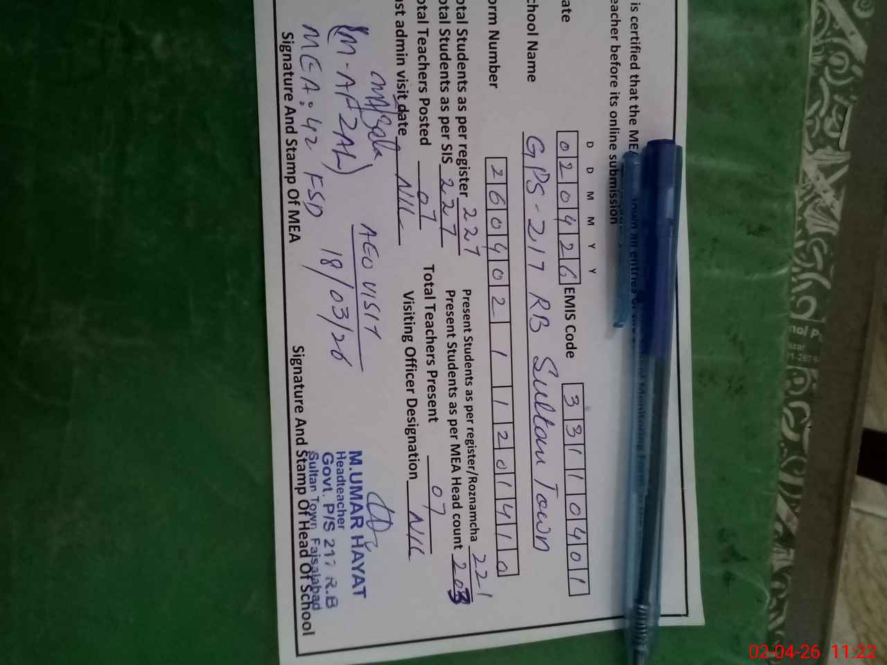 | Attendance Register | Head Teacher | MEA with School | Visit Proof |