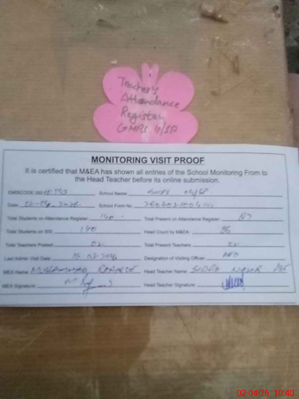 | Attendance Register | Head Teacher | MEA with School | Visit Proof |