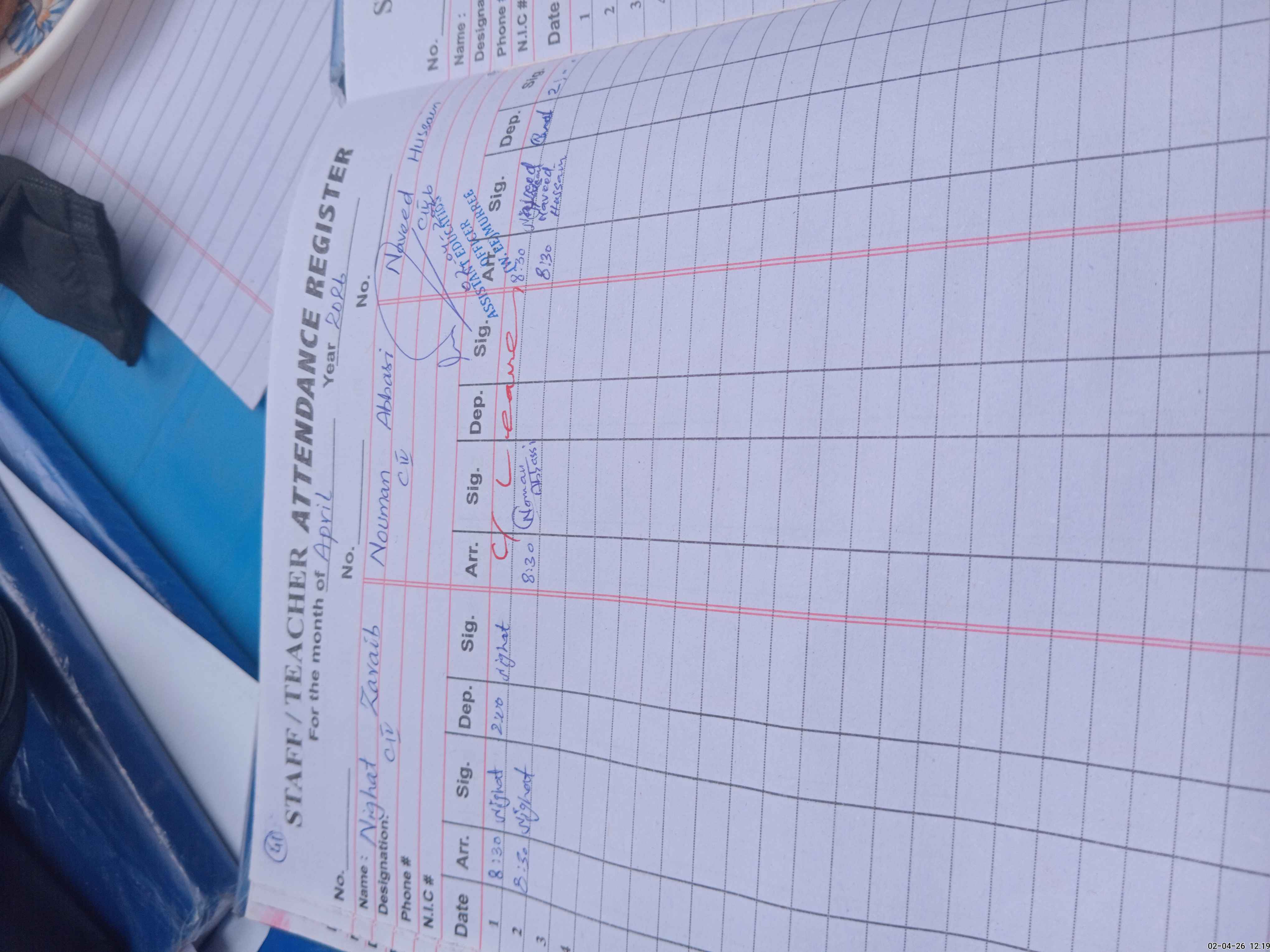 | CNIC | Full Name | Designation | R/C | Absence During Last Calender Month |