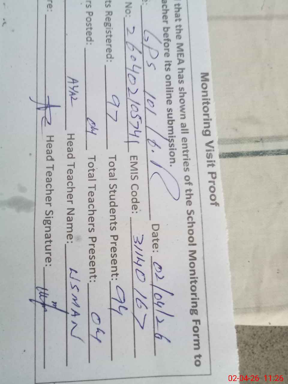 | EMIS Code: 31140167 | Name of School: GPS CHAK NO. 101/6-R | |||