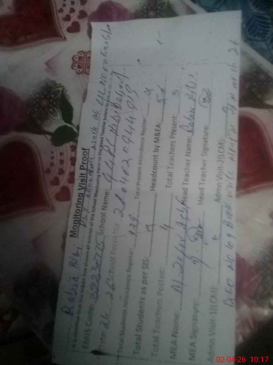| Attendance Register | Head Teacher | MEA with School | Visit Proof |