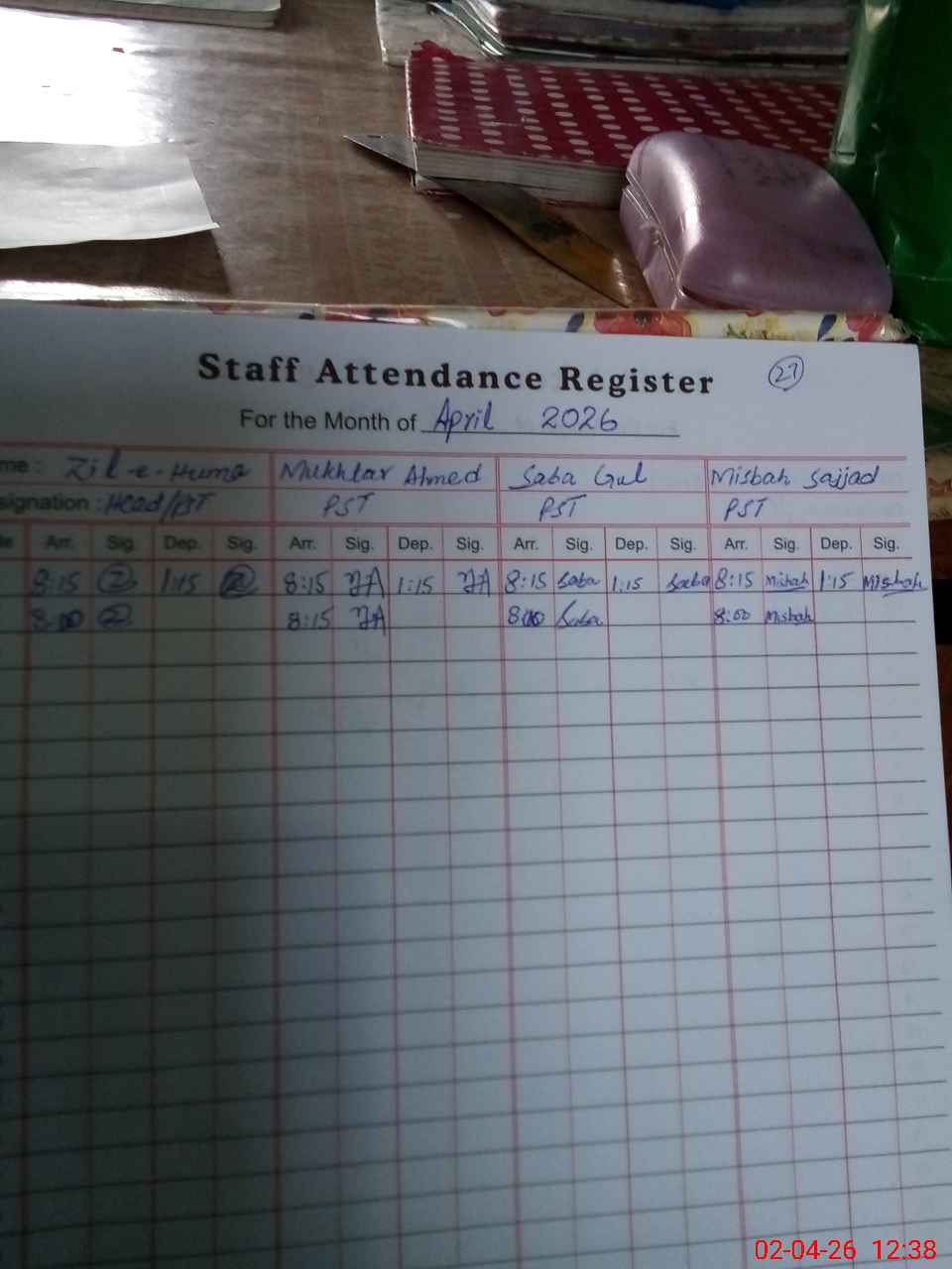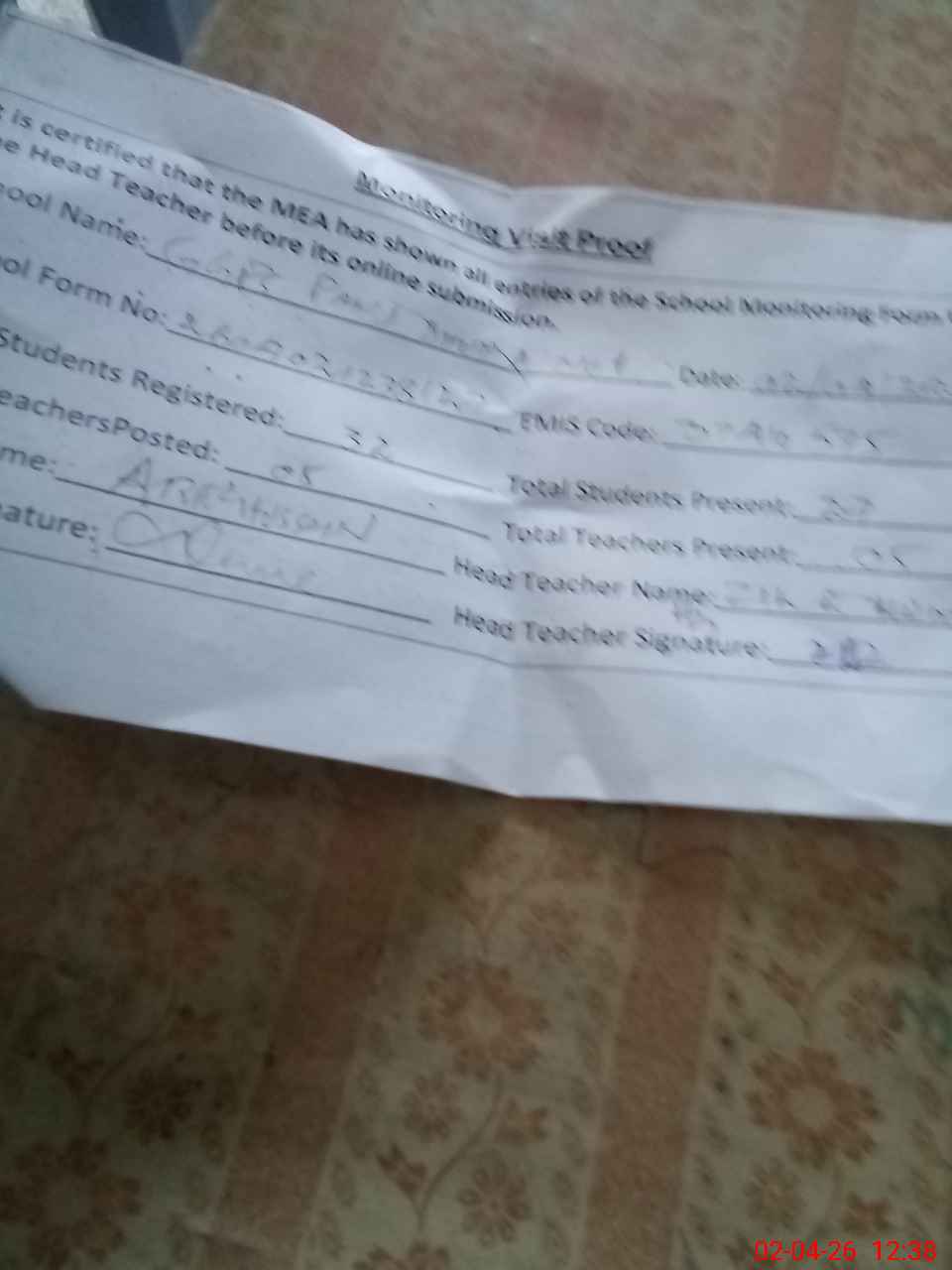 | Attendance Register | Head Teacher | MEA with School | Visit Proof |