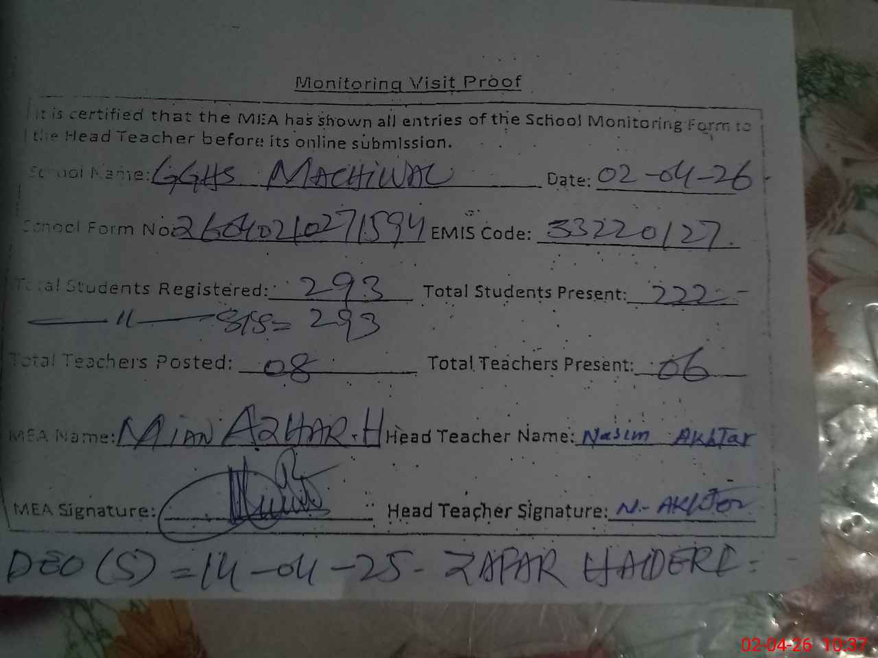 | EMIS Code: 33250127 | Name of School: GGHS MACHIWAL | |||
