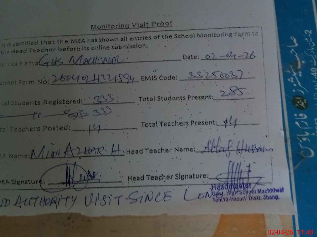 | EMIS Code: 33250037 | Name of School: GHS MACHI WAL | |||