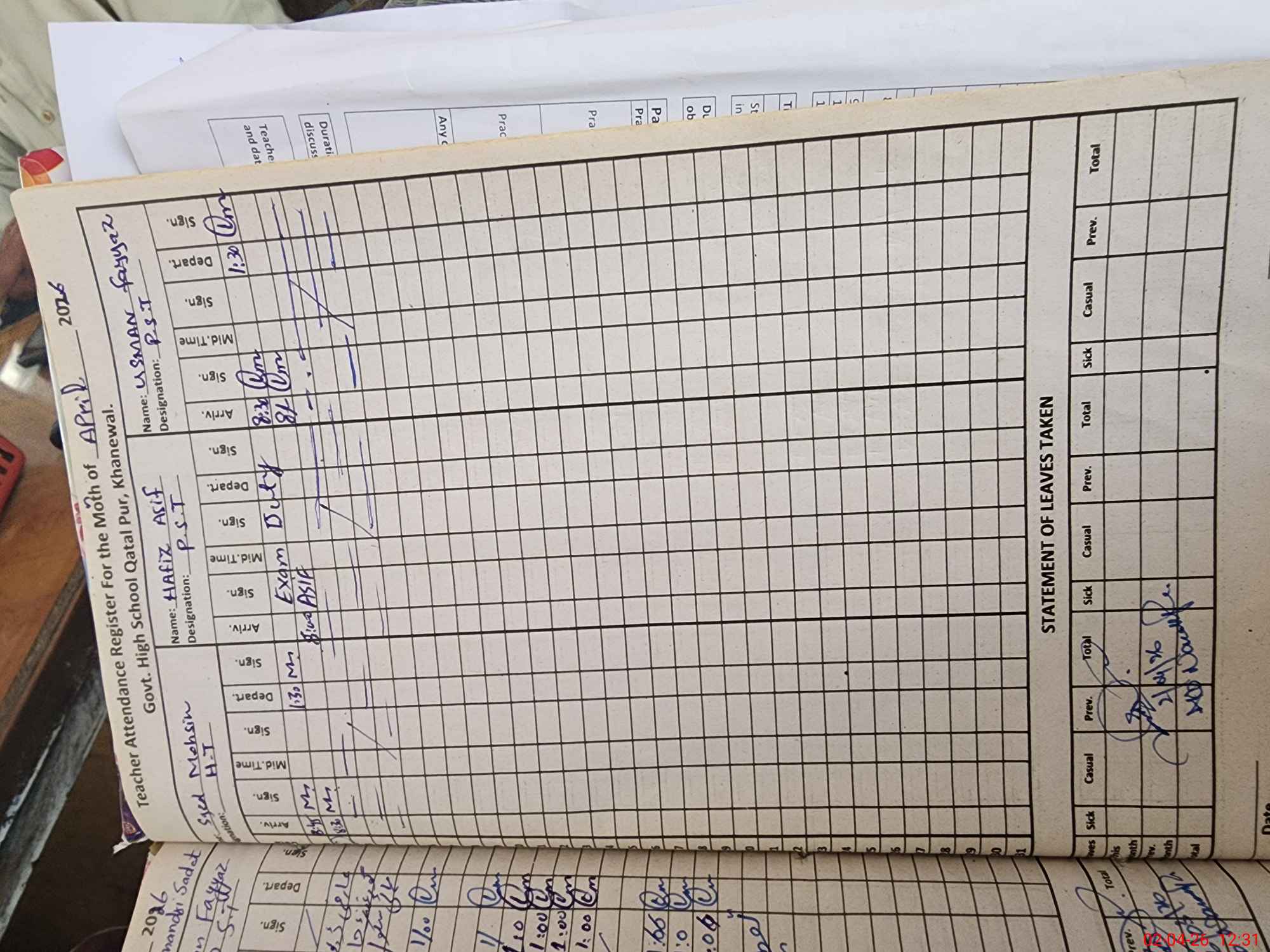 | CNIC | Full Name | Designation | R/C | Absence During Last Calender Month |