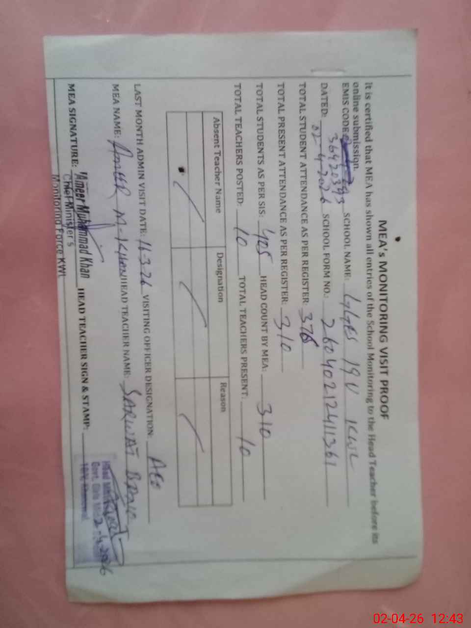 | Attendance Register | Head Teacher | MEA with School | Visit Proof |