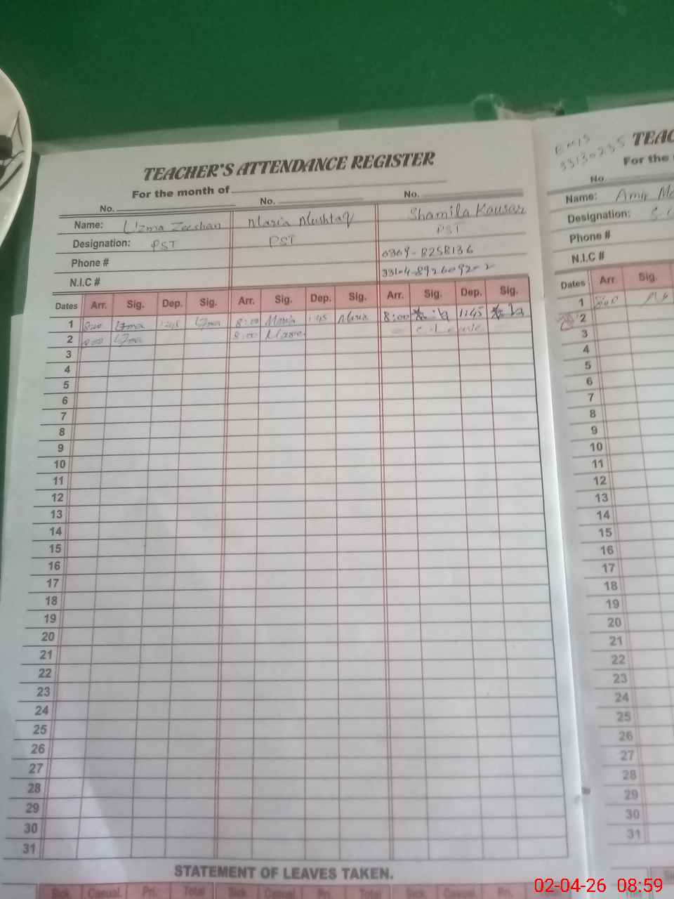 | CNIC | Full Name | Designation | R/C | Absence During Last Calender Month |